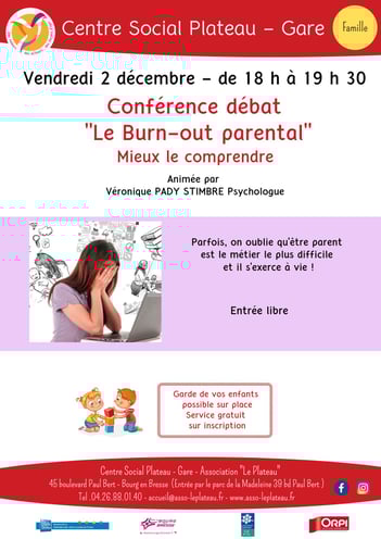 18. novembre 2022 Vendredi 2 décembre - Conférence-débat "Burn-out parental" Mieux le comprendre ! Animé par Véronique PADY STIMBRE, psychologue Venez vous informer , parler de vos expériences ... Ouvert à tous - Entrée libre Possibilité de garde de vos enfants sur place - Service gratuit sur inscription tagPlaceholderCatégories : Écrire commentaire Commentaires: 0