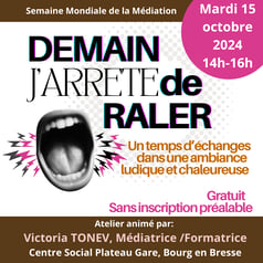 08. octobre 2024 "DEMAIN J'ARRETE DE RALER" MARDI 15 OCTOBRE 2024 Au Centre Social à 14 h Atelier "Demain j'arrête de râler " - Animé par victoria Tonev, médiatrice Ouvert à tous, sur inscription conseillée tagPlaceholderCatégories : Écrire commentaire Commentaires: 0