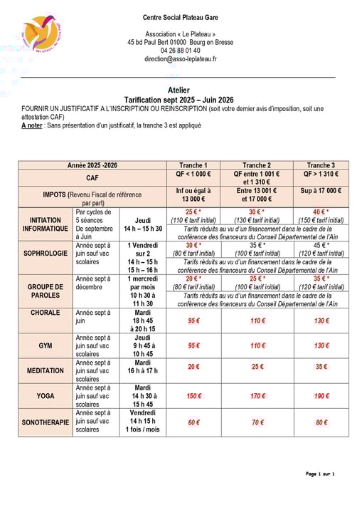 La Ville de Bourg en Bresse, la Caisse d’Allocations familiales de l’Ain ainsi que la participation des bénévoles nous permet de pratiquer des tarifs avantageux.