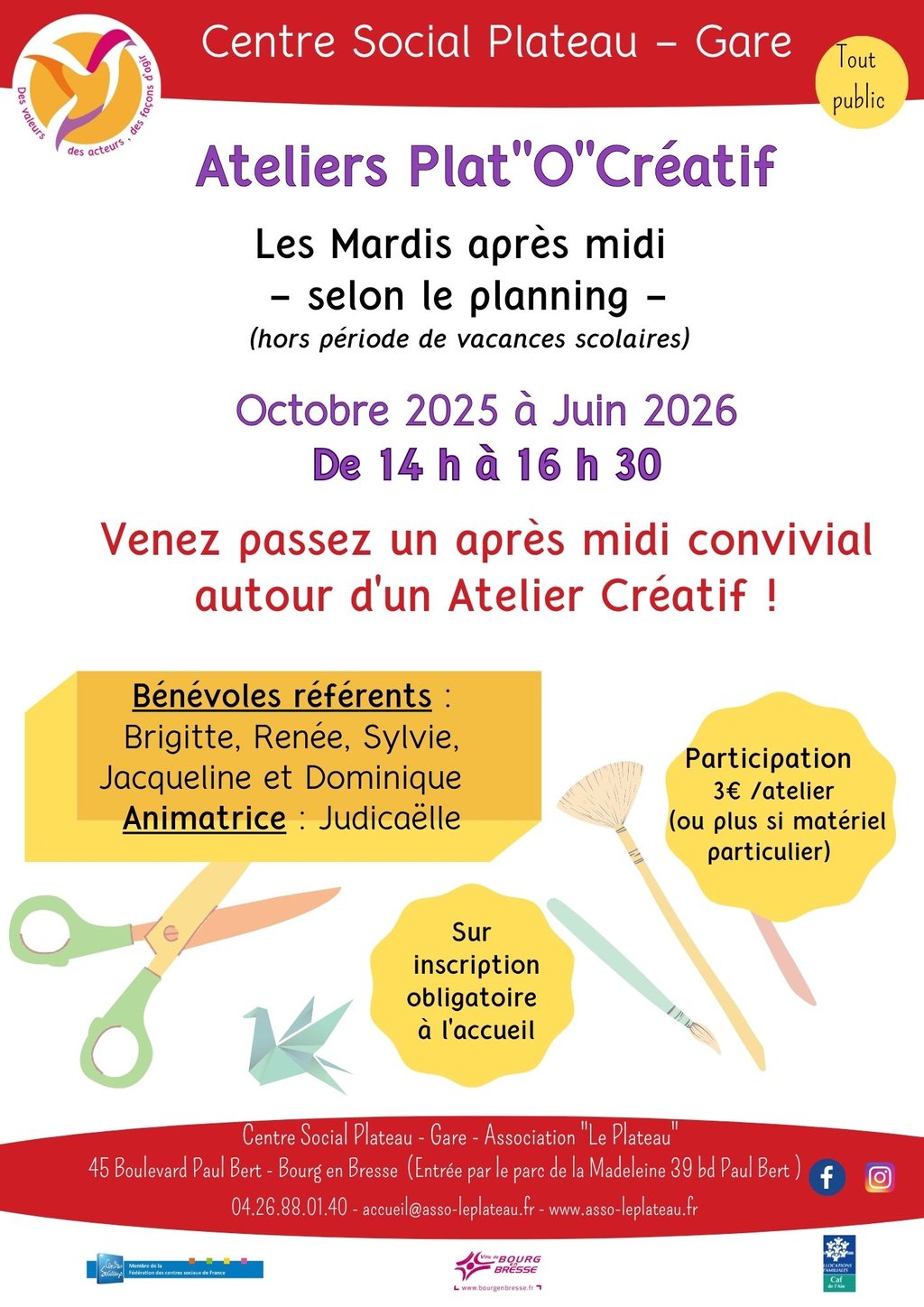Vous aimez concevoir, réaliser, bricoler, en toute simplicité. Venez rejoindre l’atelier Plat"O" Créatif animé par des bénévoles, dans une ambiance chaleureuse autour d’une tasse de café.